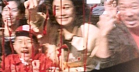 影片简直被红色淹没了,而最动人的一幕还是挑着酒菜的巩俐被日本人打中,倒下的那一幕。