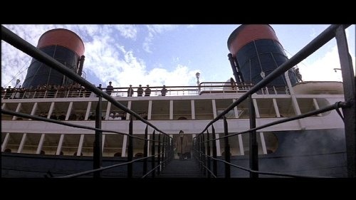 影片最动人的场景是钢琴师唯一一次试图下船踏上陆地的那一场景,钢琴师手提箱子,身着风衣,头戴礼帽,一步一步走下楼梯,但在最后停下了,他孤独的身影跟满是烟雾和水泥建筑物的城市对比起来是那么渺小,就像他说的“我恐惧的不是我看见的,而是我看不见的”。