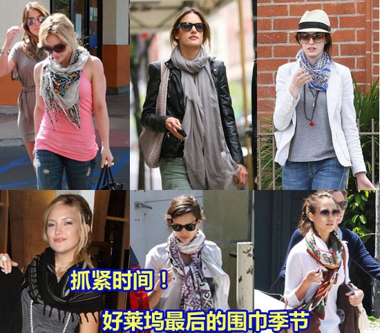 当围巾成为潮流重量级配饰的时候它的时尚加之远远好过了实用价值。围巾从冬季一个高歌到春季,尤其是花朵围巾备受好莱坞女星宠爱。 希拉里-达芙的花围巾、妮可-里奇的大红围巾都是亮点。至于围巾的系法,层叠厚重感的搭配绝对唱主调!
