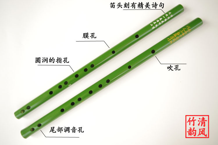 竹笛由一根竹管做成,里面去节中空成内膛,外呈圆柱形,在管身上开有1个吹孔、1个膜孔、6个音孔、2个基音孔和2个助音孔。笛身由一根竹管做成,里面去节中空成内膛。笛塞 用软木材制成的塞子,装在吹孔上端管内一定的深度里。吹孔:是笛身左端第一个孔。笛子能发音,就是通过吹孔把气灌进笛管内,使笛膜和竹管内的竹簧产生振动。膜孔:是笛身左端第二个孔。主要用来贴笛膜。笛膜在这里起着变化音色的作用。笛子没膜孔,也能吹奏,但得不到有笛膜的那种独特的音色。笛膜:一般是用芦苇膜做成的,经揉纹后取一小方块使用。经过气流振动笛膜,便能发出清脆、明亮的声音。音孔:(按指孔)共有六个,分别开闭这些音孔,就能发出高低不同的音。