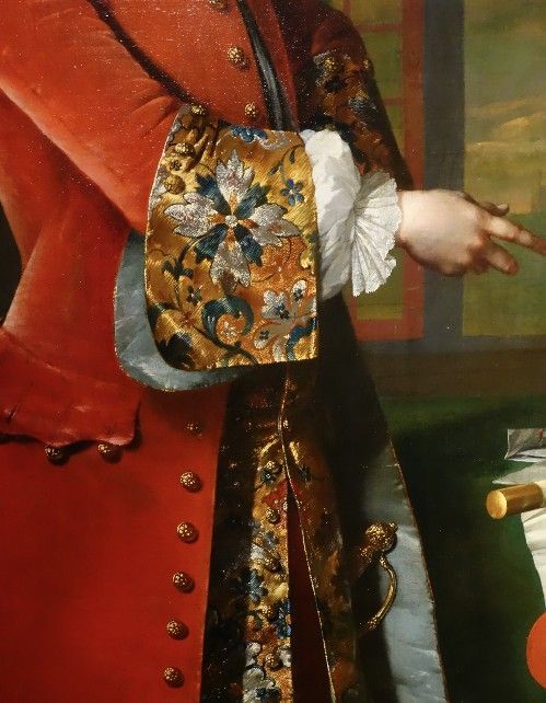 18世纪的肖像画中,绅士贵族服装上华丽的刺绣与装饰细节。