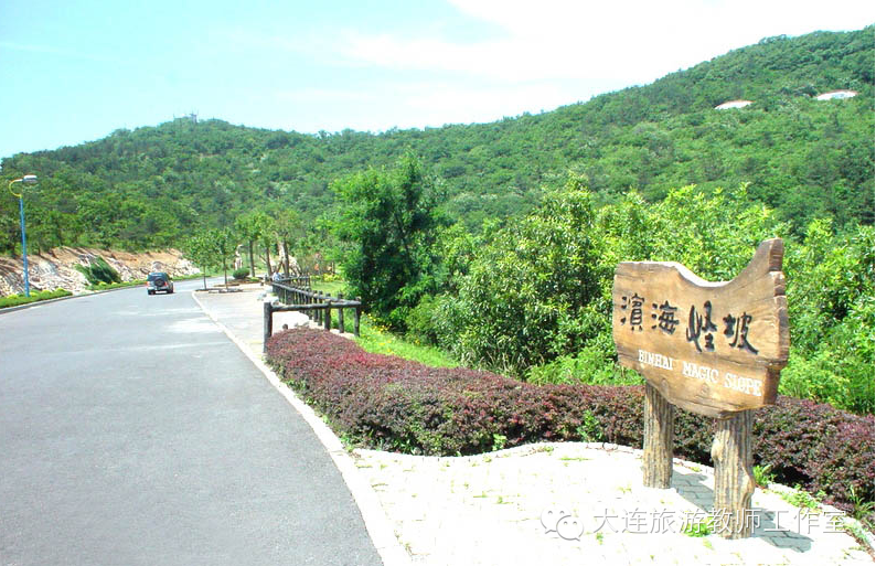 [2]滨海怪坡:怪坡位于大连海之韵公园内,在滨海路北段十八盘的上部地段。十八盘”是对滨海路一段“S”形弯度极大的陡峭山路的通俗称呼。“怪坡”一段长52米,宽4米,看起来显然是东高西低的坡度,但驾车来此停住不动,汽车会被一股神秘力量牵引往坡上方向驱动,前行速度不是慢腾腾勉强方可感觉而是相当明显的那种,人称“倒行逆驶”。如果骑自行车来这里感觉就更妙,骑车人不用蹬就可驶向坡顶,反之下坡时则要用力蹬。人称“不用拉,不用拽,不用凳,不用踹,上坡就是比下坡快”。