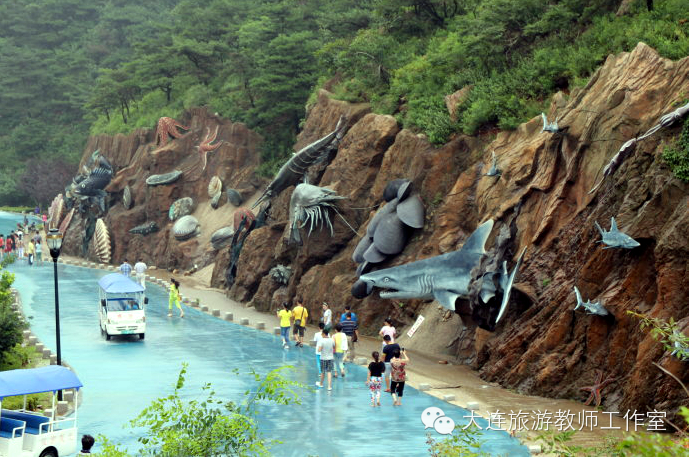 海之韵公园,游览路线有7.6公里,有南门、趣园、憩(qì)园、大蚂蚁、 駅(yì)[1]园、亲海路、旭日广场、怪坡[2]、海底大峡谷 [3](十八盘)等景观。