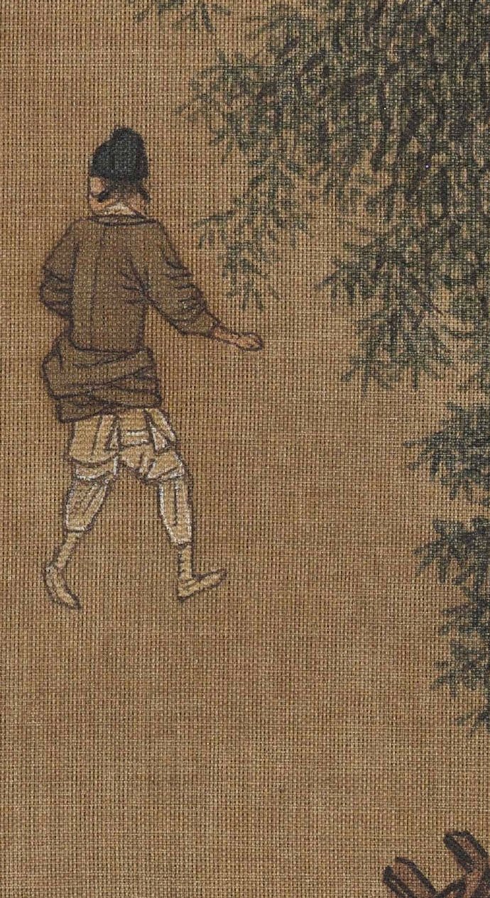 图中一行人城外春游归来,那时候没有高速免费一说,大家悠哉地穿过林荫向城门走去。骑在马上的老年官员应是主人,仆人们你挑着担,我牵着马,尽兴而归