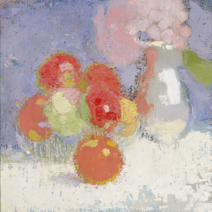 她在这里使用了许多不同的颜色:各种深度的绿色、芥末黄、粉红色,以及背景中的紫色。这些颜色非常漂亮,也可以相互平衡。谢夫贝克认为苹果是最难画的水果。