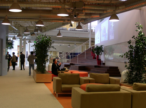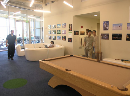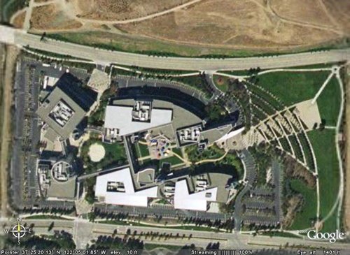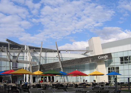Googleplex位于加州山景城北部的查尔斯路,露天剧场百汇和海岸大道之间,靠近海岸公园的湿地。员工居住在旧金山或东海湾,由带有Wi-Fi功能的谷歌补贴汽车接送往返工作,汽车以由美国生产和加工的生物柴油作燃料。
