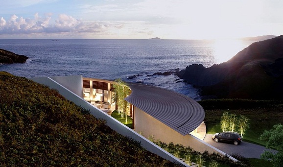 住宅明确有力的曲线适合基地的环境,形式大胆而协调,成为该项目的特征。住宅位于一个迎风的,由风暴和海水侵蚀出的山坡上。住宅采用扇形的平面,可以由此鼓励居住者之间互相交流,同时环境可以融入房间和庭院。