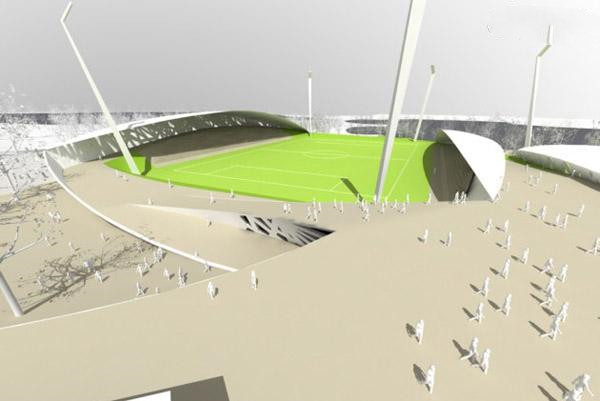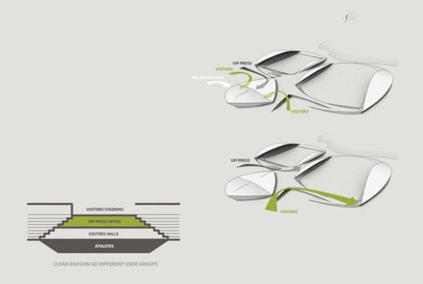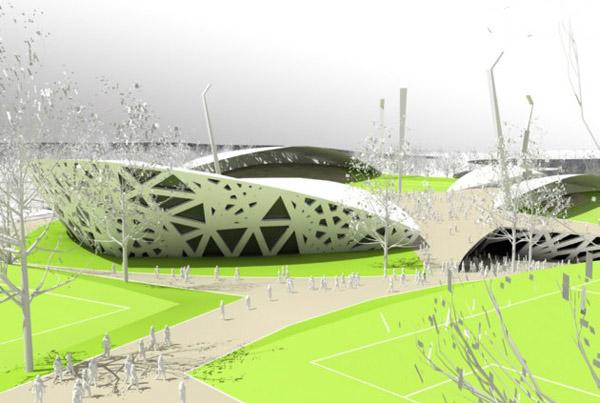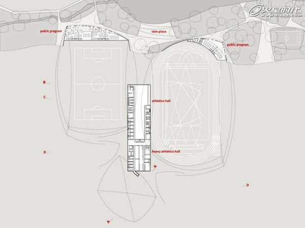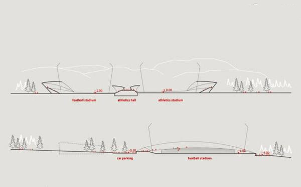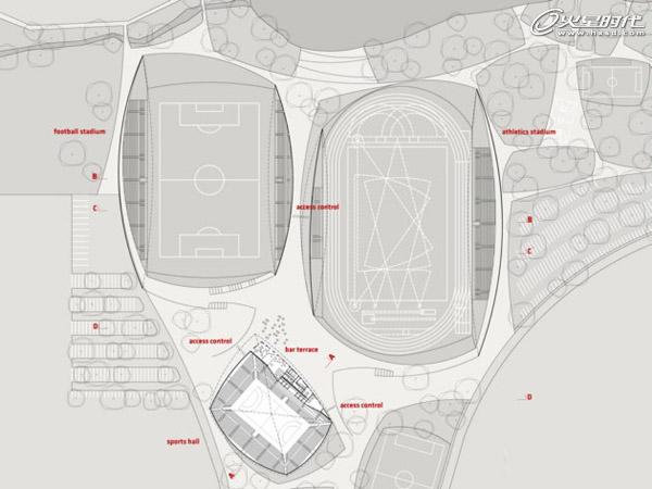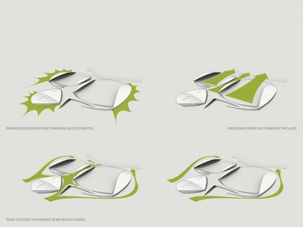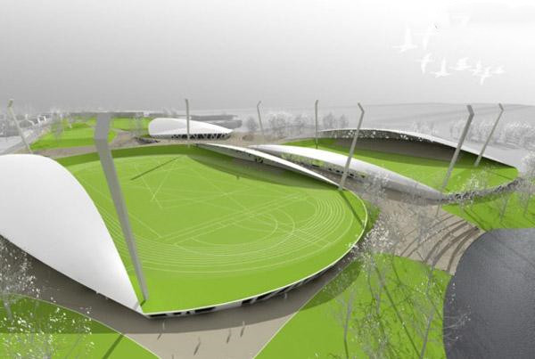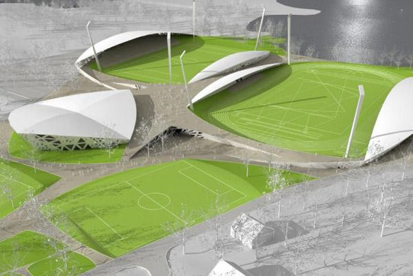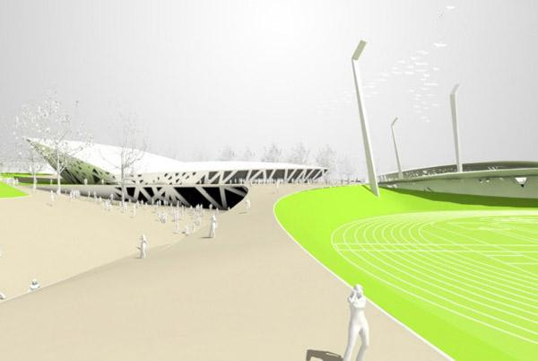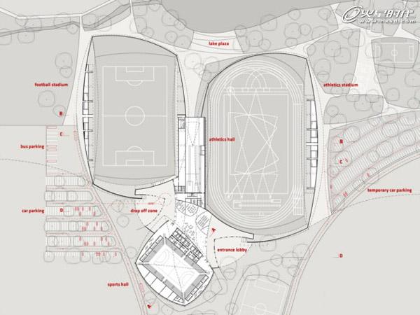 比赛要求的三个部分——体育馆、田径场和足球场环绕在常规运动场地中心区的周围,这个中心区建造在在各个运动场间连接通道的下方。公共商业项目设计在湖边,而体育公园内其他的项目都面向这个湖泊。所有的运动场地周围都被绿地所围绕。