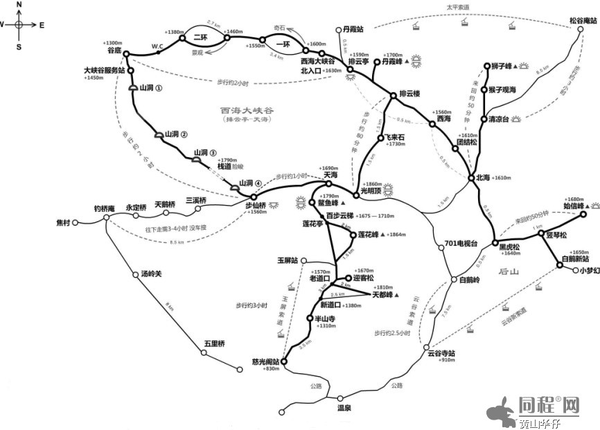 D1:汤口-云谷寺-白鹅岭-黑虎松-始信峰-黑虎松-北海-狮子峰-北海-西海-排云楼-排云亭-西海大峡谷北入口封门处-排云亭-飞来石-光明顶-步仙桥-海心亭-天海(晚上住宿天海的白云宾馆或天海山庄);