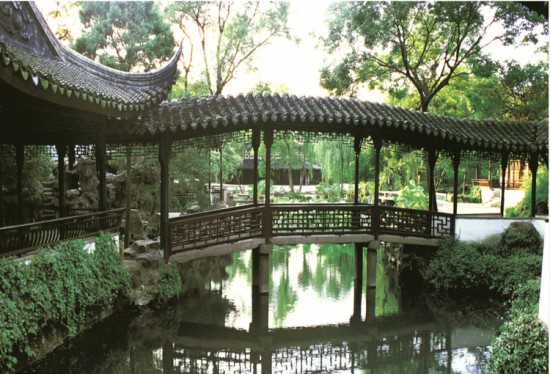 沧浪亭:苏州最古老的园林,原为五代吴越广陵王的池馆。沧浪亭以清幽古朴见长,融园内的假山与园外的池水于一体,在假山与池水之间,隔着一条复廊,廊壁开有花窗,透过漏景,沟通内山外水。据说全园有108种花窗样式,图案花纹变化多端,构作精巧,是苏州园林花窗的典型。