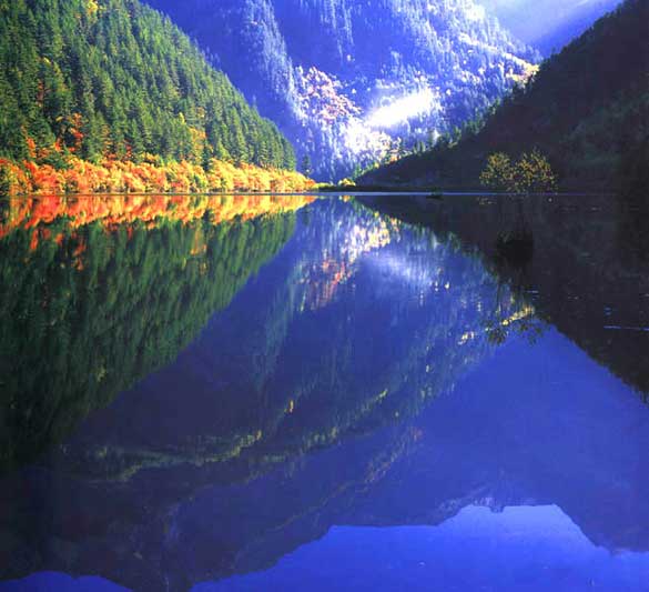 水,是九寨沟的精灵,而九寨沟的海子(湖泊)更具特色,湖水终年碧蓝澄澈,明丽见底,而且随着光照变化、季节推移,呈现不同的色调与水韵。秀美的,玲珑剔透;雄浑的,碧波不倾;平静的,招人青睐,每当风平浪静,蓝天,白云,远山,近树,倒映湖中。“鱼游云端,鸟翔海底”的奇特景色层出不穷,水上水下,虚实难辩,梦里梦外,如幻如真。彩池则是阳光,水藻和湖底沉积物的“合作成果”。一湖之中鹅黄,黛绿,赤褐,绛红,翠碧等色彩组成不规则的几何图形,相互浸染,斑驳陆离,如同抖开的一匹五色锦缎。视角移动,色彩亦变,一步一态,变幻无穷。有的湖泊,随风泛波之时,微波细浪,阳光照射,璀灿成花。远视俨如燃烧的海洋,有的湖泊,湖底静伏着钙化礁堤,朦胧中仿佛蛟龙流动。整个沟内,奇湖错落,目不暇接。百余个湖泊,个个古树环绕,奇花簇拥,宛若镶上了美丽的花边。湖泊都由激流的瀑布连接,犹如用银链和白涓串连起来的一块块翡翠,各具特色,变幻无穷。