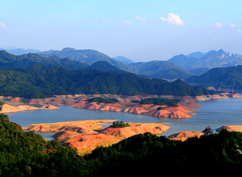 最奇特水上丹霞:要观赏泰宁水上丹霞奇观,最为当地人推崇的,就是美丽的大金湖,碧波粼粼,丹霞地貌那丹红色的山峰和岛屿就如同出水芙蓉般散落在宽阔清澈的水面上。远处岸边,青山连绵,绿树翠竹掩映着零星的农舍村落。偶尔出现的小渔船仿佛一曲《渔舟唱晚》回荡在耳边。
