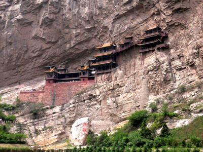 悬空寺,位于恒山金龙峡的半崖峭壁间,始建于北魏太和十五年(公元491年),迄今已有一千五百多年的历史,是国内现存唯一的佛、道、儒“三教合一”的独特寺庙。整座寺院上载危崖,下临深谷,楼阁悬空,结构巧奇。共有店阁四十间,利用力学原理半插飞梁为基,巧借岩石暗托,梁柱上下一体,廊栏左右相连,曲折迂回,虚实相生。古人云:“蜃楼疑海上,鸟道没云中。”唐代诗仙李白醉书“壮观”二字。明代大旅行家徐霞客叹其为“天下居观”。
