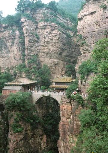 苍岩山桥楼殿是我国三大悬空寺之一。据考证石桥为隋代建筑,略早于赵州安济桥。桥上的楼殿为唐代建筑。它坐西向东,长15米,宽8米。从力学角度看,此殿重量及游客满载时,总重量约在35吨左右,按此推算,桥的拱记应在3.5到4米之间,而该桥却拱高2.8米。其横跨在两山峭壁之间,为敞肩拱式,翼角高翘,流苏彩绘,高架于云天雾海之上,有高不可攀之威、腾空欲飞之势。建于桥上的桥楼殿内有释迦牟尼佛、阿弥陀佛、药师琉璃光王佛三尊佛像,正中背面塑观音像,殿内两侧十八罗汉像。