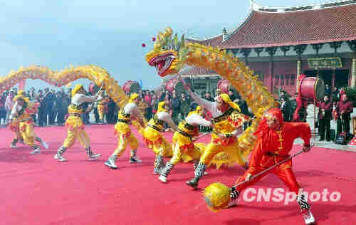 五、舞龙舞狮 舞龙灯,也称龙舞。它的起源可以追溯上古时代。传说,早在黄帝时期,在一种《清角》的大型歌舞中,就出现过由人扮演的龙头鸟身的形象,其后又编排了六条蛟龙互相穿插的舞蹈场面。见于文字记载的龙舞,是汉代张衡的《西京赋》,作者在百戏的铺叙中对龙舞作了生动的描绘。而据《隋书?音乐志》记载,隋炀帝时类似百戏中龙舞表演的《黄龙变》也非常精彩,龙舞流行于我国很多地方。中华民族崇尚龙,把龙作为吉祥的象征。 舞狮子是我国优秀的民间艺术,每逢元宵佳节或集会庆典,民间都以狮舞前来助兴。这一习俗起源于三国时期,南北朝时开始流行,至今已有一千多年的历史。 六、划旱船