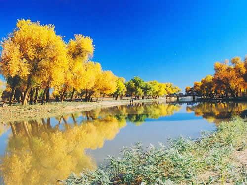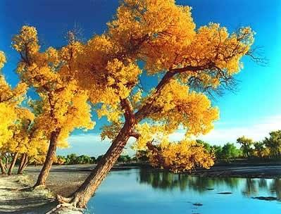 西北的秋色,因为额济纳和南疆轮台那“三千年不死,三千年不倒,三千年不朽”的胡杨而显得有些悲壮,在高大挺拔的胡杨面前,秀丽迷人的额济纳湖秋色似乎仅成了一种点缀。