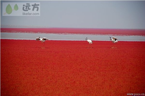 之所以少有人知是因为红海滩出现的时间太短了,只有在这个恰当的地方和恰当的时候才会出现退潮后鲜艳的碱蓬草和丹顶鹤配合的美丽画面。