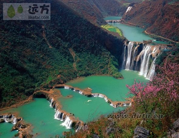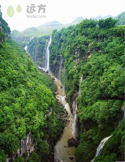 还有一个有特色的瀑布在贵州,一个叫马岭河的地方,那是一个峡谷,峡谷之间跨越一座大桥,在大桥上可以看见峡谷上无数的河水漫开流到峡谷里,一缕缕飘渺的瀑布悬挂在整个峡谷间,看图片你就知道有多么漂亮。