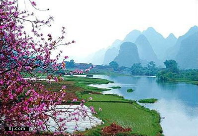 美丽的漓江,似少女挥舞着的青罗玉带,从西街的东面飘飘而过,东岭朝霞、书童独秀、龙头山、西郎山、马鞍山、碧莲峰似万朵莲花簇拥着这条古香古色的街道。