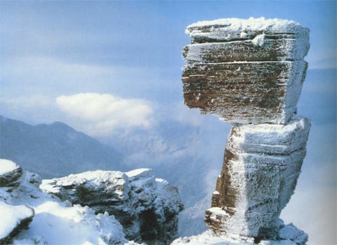 峨眉山金顶雪景中国佛教四大名山之一。位於四川盆地西南缘。有山峰相对如蛾眉,故名。包括大峨眉、二峨眉、三峨眉、四峨眉。主峰3079.3米,高出成都平原2,500∼2,600公尺。为褶皱断块山地,断裂处河谷深切。一线天、舍身崖等绝壁高达700∼850公尺。山势雄伟,隘谷深幽,飞瀑如帘,云海翻涌,林木葱茏,有“峨眉天下秀”之称。山上多佛教寺庙,向为著名游览地。