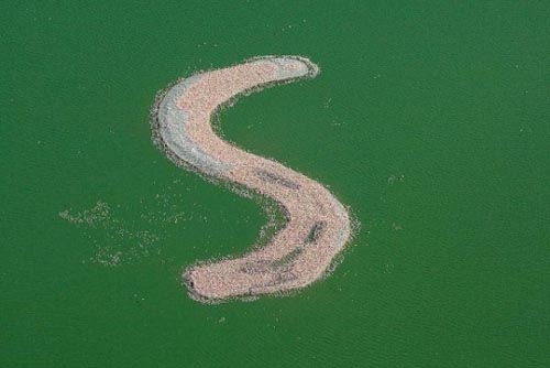 南非金伯利市的卡姆菲斯大坝是世界上六大小火烈鸟(Lesser Flamingos)栖息地之一。这个S形的岛屿于2006年竣工,并被用作鸟儿的庇护所,其周围聚集了高密度的蓝绿藻。今天这个鸟类保护区因为水质恶化和洪水泛滥而受到威胁。