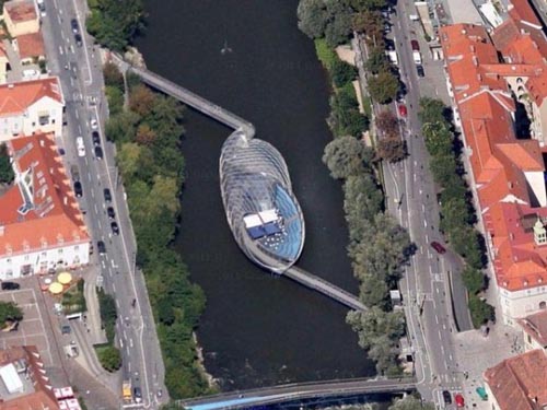 纽约艺术家维托·阿肯西(Vito Acconci)在奥地利东南部城市格拉茨(Graz)的穆尔(Mur)河上设计了这个海贝形的漂浮岛。它里面有一个咖啡馆。没顶的部分是一个圆形的公共露天剧场。