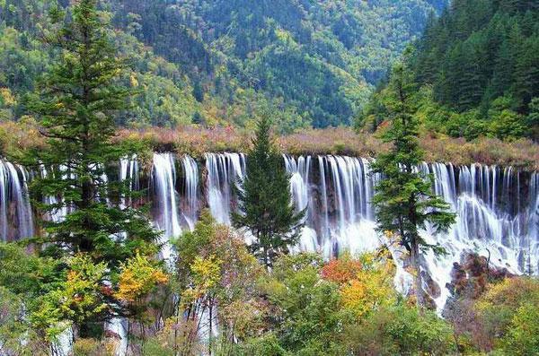 曾几何时,这块素有“天府之国”的土地上,这条“难于上青天”的蜀道中,有过多少殊死鏖战,又有多少生灵涂炭呵!纵揽我国瀑布,或从断崖蓦然跌下,势若大海倒泻,银河决口,声势恢宏;或从峭壁凌空飞落,状如白绫脱轴、袅袅娜娜,姿态千般;或从洞上翻崖直下,形若水晶珠帘,垂挂洞前,妙趣横生。而九寨沟瀑布群,则从长满树木的悬崖或滩上悄悄流出,瀑布往往被分成无数股细小的水流,或轻盈缓慢,或急流直泻,千姿百态,妙不可言,加上四周群山叠翠,满目青葱,至金秋时节,层林尽染,瀑布之景就更为神奇秀丽了。九寨沟瀑布群,主要有诺日朗瀑布、树正瀑布和珍珠滩瀑布组成,此外还有若树正群海间的梯瀑群等无数小瀑布。