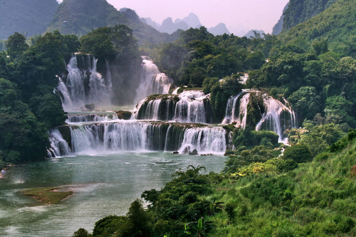 这里山峰奇巧,云雾飘杳,湖若明镜,江如玉带,怪石峥嵘,古木参天,步步是景,处处含情。春日,红棉怒放,灿若云霞;夏临,青峰浴水,花木繁茂;秋至,金风送爽,遍地金黄;冬来,群峰峭拔,山色空朦。无论阴晴云雾,季节交替,均各具情态。游德天,能令您仿如书中,心无纤尘。山水画廊云集国家特级景点及一二三级景点40余个。国家特级景点德天瀑布气势磅礴,银瀑泻,三级跌落, 为壮观,其魄力、其气势、其风采,震魂摄魄,摇动心旌。与紧邻的越南板约瀑布相连,堪称为世界第二大跨国瀑布。然而,德天景区风景之美,又岂止只是德天瀑布呢?奇峰夹峙,树木葱茏的黑水河,绮丽多姿的那岸奇景,怪石遍布的雷平石林和水上石林,层峦叠嶂、溶洞遍布的恩城山水及自然保护区,水平如镜、石峰玉立的乔苗平湖,鬼斧神工、造型奇特的龙宫岩,多级跌落翻滚的沙屯叠瀑,具有特殊意义的53号界碑,无数的古迹文物和珍稀动物……。这些已经令您目不暇接,但美景远在后头,且看山峦从翠,奇峰错列,轻纱缭绕,霞落云飞,山影平湖,茂林翠竹,花草掩映,百鸟低徊,绿水梯田,民居水车,小桥流水,耕夫荷锄,村童在小河中嬉水,竹筏在秀水中穿行,这就是素有“小桂林”之称的明仕田园和五百里画廊为您展开的一幅又一幅宁静抒情的南国特有的风光风情画卷. 置身于山水画廊中,处处是书,这又岂止是丹青妙手所描绘的呢?真可谓德天归来不看书。抛开一切烦嚣,融入大自然的怀抱吧!与山水相依,在清幽绝俗的山水书廊中,您的心灵将得到净化。