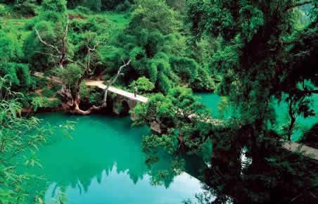 小七孔的景点都是沿山路分布的,最好的游览方法便是坐着当地农民赶着的驴车漫步其中。一路上,一侧是山,一侧是水,时而能看到参天的大树倒栽葱地倒在水里。树的根部已经枯死,而泡在水中的枝干却有的发芽并长出了绿色的枝叶,横漂在水中。尤其美的是这里的水,虽然是一条长长的河,间隔不久便会有很大的落差,看上去是由一个接一个的小瀑布组成。有时落差间隔很小,一层层的瀑布便连成了一片,白花花的水帘从绿色的石头上流过,流入清澈见底的河流当中,其间还有许多水灵灵的水草。且不说如此的美景,就是这一路上的水声也足以让人心旷神怡了。