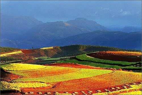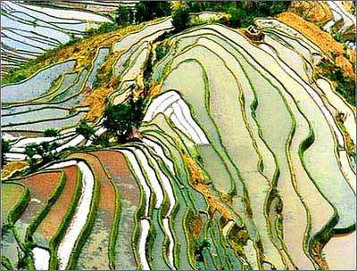 层层叠叠的梯田,天梯一样沿着山坡直上云天。梯田适合开在土质好、水源充足的向阳坡地,云南哀牢山地区属于海洋性亚热带气候,雨量充沛,那里的人们开垦了规模庞大、世界闻名的梯田。其中元阳的梯田比较有代表性,特别是云雾天气多的季节,山坡上大片的梯田在云雾笼罩下,就像从人间登上天堂的天梯,非常壮观美丽。