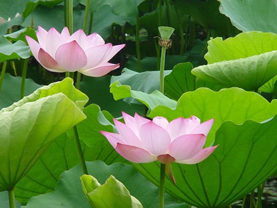 湖北洪湖的荷花久负盛名,成了中外游人争相游玩的胜地,每到夏令,百里洪湖烟波浩渺,荷流香波,花吐莲蓬,艳丽妩媚。远看,一片片荷叶如翻滚绿波,花若红云;近看,叶如伞状,有的浮于水面,有的凌于碧波之上,相互簇拥,花有白的、桃红的、粉红的,朵朵绽开在绿叶丛中。清风徐徐,泛舟湖上,恍若置身于如诗美景中,真有“粉尖花色叶中开,荷气衣香水上来”的感受。