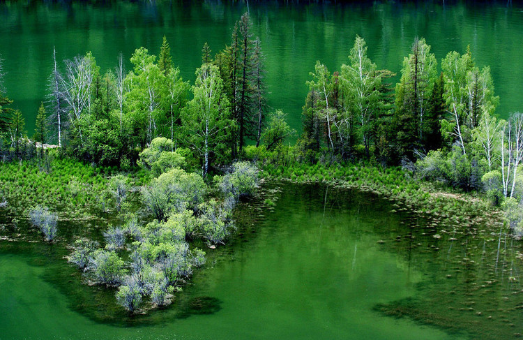 喀纳斯湖,是新疆阿勒泰地区布尔津县北部一著名淡水湖,位于阿尔泰山脉中,外形呈月牙状,被推测为古冰川强烈运动阻塞山谷积水而成。是中国唯一的北冰洋水系。该湖风景优美,四周林木茂盛,为中国国家5A级旅游景区。湖水最深处达198米左右,是中国唯一的北冰洋水系。湖面碧波万顷,群峰倒影,湖面还会随着季节和天气的变化而时时变换颜色,是有名的“变色湖”。喀纳斯湖上端,有湖心岛浮于水面,四周皆森林茂密,湖水碧绿纯净。