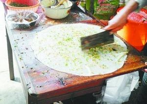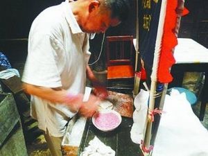 馄饨吃过不少,但是大多数普通早点摊的馄饨,都是买来现成的机器压制而成的馄饨皮,然后拿热水把料冲一冲,再加入煮好的馄饨而已。可是屯溪老街上的高汤馄饨却并非如此。首先,馄饨皮一定是手擀的,薄到有晶莹透亮的感觉。其次,煮馄饨的锅有两个盖子,右边是煮馄饨的热水,左边是高汤,里面有很多大骨头,在碗里加入调料之后,舀一大勺高汤,然后捞起煮熟的馄饨放进去。馄饨都是现点现做,大中小碗都有,丰俭由人。我曾经问过摊主,这小碗馄饨有多少个?他回答:“不知道呀,就是凭感觉抓一把。”事实证明,这一把有多无少,小碗对于我来说,分量够足了