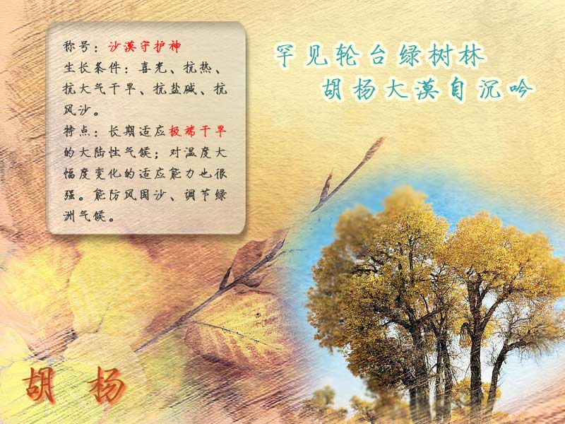 胡杨是落叶中型天然乔木,直径可达1.5米,木质纤细柔软,树叶阔大清香。耐旱耐涝,生命顽强,是自然界稀有的树种之一。胡杨树龄可达200年,树干通直,高10-15米,稀灌木状。树叶奇特,因生长在极旱荒漠区,为适应干旱环境,生长在幼树嫩枝上的叶片狭长如柳,大树老枝条上的叶却圆润如杨。
