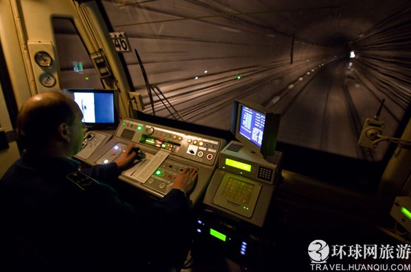从检票口到站台由一个巨大的通道连接,人站在扶梯上由地面缓缓进入地下,这时间大约持续1至2分钟,扶梯左侧是20个球型灯,每个球型灯之间相隔3米左右,一来一回便是40个。
