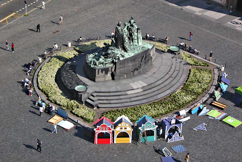 瓦兹拉夫广场中心高高矗立者圣瓦茨拉夫二世的塑像,他是捷克民族最早的普舍密什尔王朝瓦茨拉夫王公,后被奉为捷克的守护神。 四个守护神分别是圣德来拉和普罗可朴,后面两个是阿乃什卡和沃依捷赫。纪念碑显示着民族独立自由的伟大精神,所以它的周围正是捷克民众在民族危难时集会示威的地方,是近代历史事件的见证人。雕塑前的花环是为纪念1969年抗议华沙条约军队入侵和1989年法兰绒革命的牺牲者。