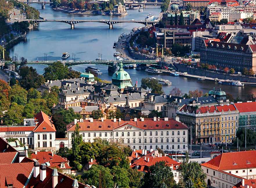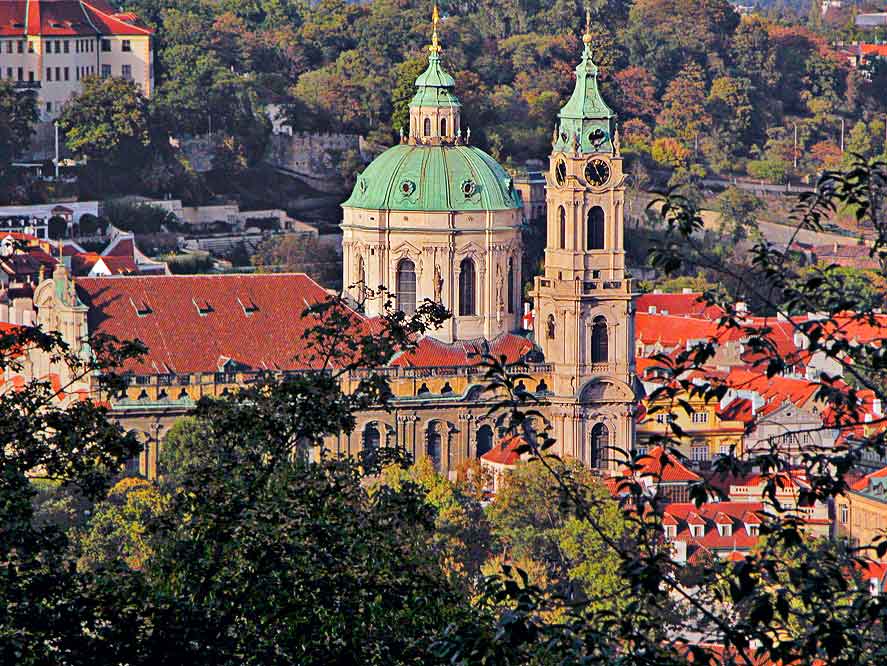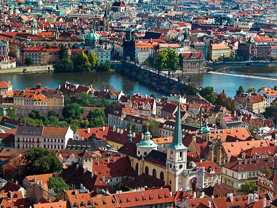 美丽的首都布拉格坐落在起伏的丘陵和捷克中部广柔平原的中间,蜿蜒北去的伏尔塔河Vltava浇灌孕育了这座美丽的城市,在夏日,站在市中心的彼特什公园高地上视野宽阔,极目远望捷克中部的田野森林,朦胧缥缈,引人向往,秋天天高气爽,登山瑞施卡高地,瞻仰英雄在战马上的威严形象,耳边就会响起满山遍野的胡斯战士杀敌声,回首四望山下林林总总的深褐色古老建筑,红色楼房和众多的教堂尖顶,再加上大片的丛丛郁郁的树林和碧绿草地,相互映衬,让人深切感受到一千多年文明史的积累和大自然美的交响,真要感谢和赞美万能的上帝!感谢上帝把我们带到了这片美丽的国土。
