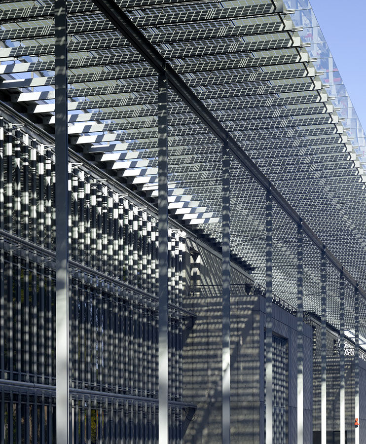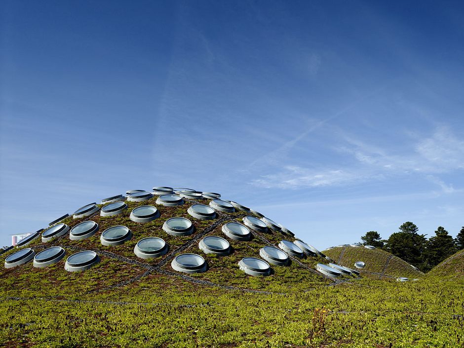 大厅屋顶:2.5英亩的屋顶与9种植物的生长地连为一体,作为当地野生动物栖息。七寸的土壤基质使其成为了一个天然的保温屋顶,每年积蓄约200万加仑的雨水。