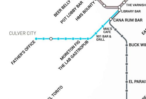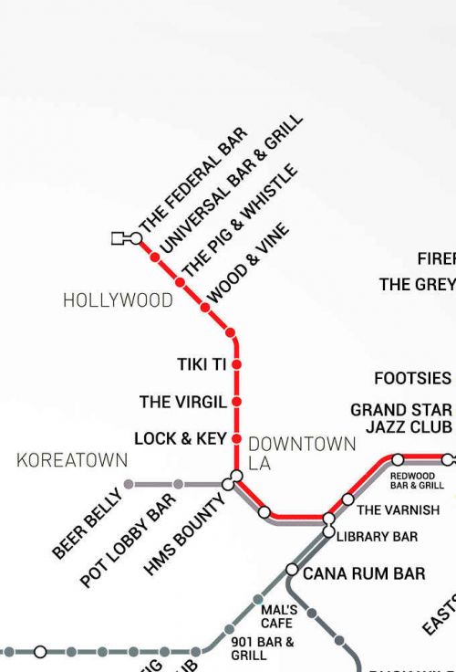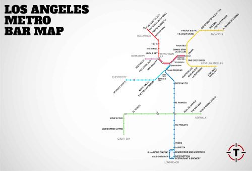 LA捷运地图神奇地变成了LA捷运酒吧地图!不管你从Metro Rail的哪条线的哪个站下去,步行十分钟之内,必能找到酒吧,不醉不归!