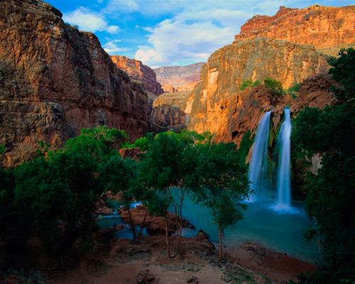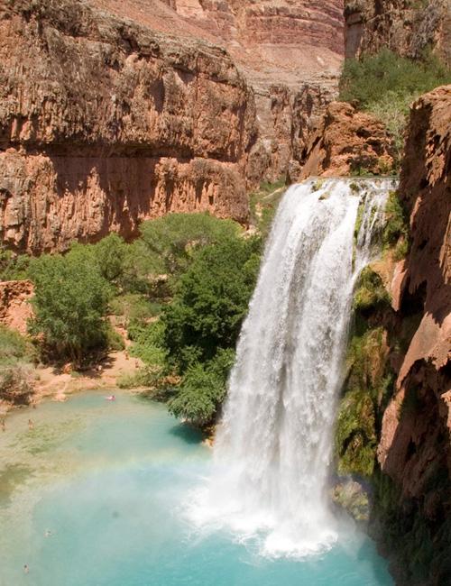 位于美国亚利桑那州大峡谷国家公园的哈瓦苏瀑布有着它独特的美。凉爽、清澈的水沿着红色的峡谷岩石倾泻而下,形成一个美丽的水池。哈瓦苏人将它视为一条神圣的瀑布。游客们可以远足或是骑着由当地人提供的马或骡子去观赏瀑布。