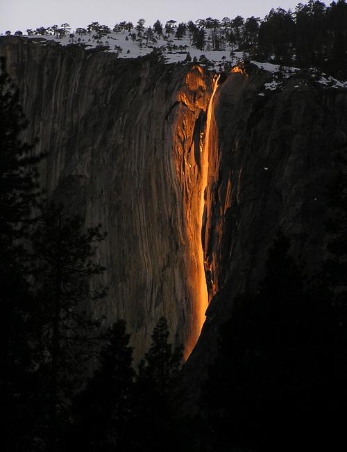 位于美国加州约塞米蒂国家公园的马尾瀑布虽在加州所有国家公园的瀑布中算不上最大的,但它却是世界上最神奇的瀑布之一。马尾瀑布流经埃尔卡皮坦岩壁东部边缘,在二月下旬极为晴朗的日子,太阳下山时,人们可以看到颇为壮观的“火瀑布”。