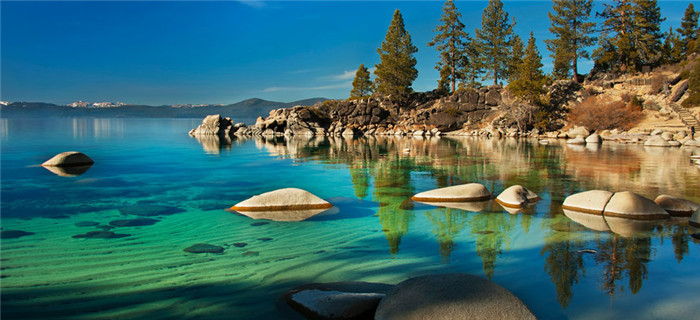太浩湖湖水澄净湛蓝,是北美最大的高山湖泊,周围雪山环抱,大作家马克吐温认为这里是世界上最美的地方,它因其清澈透明的湖水和壮丽的风景而闻名。