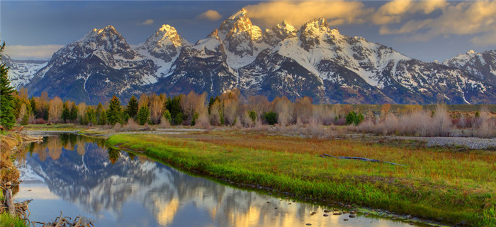 大提顿山脉千峰弄雪,是美国落基山脉的精华所在,大文豪海明威将其称为美国境内的瑞士,派拉蒙电影公司的片头就是大提顿的主峰,如画山水倒影在冰湖上,堪称绝景。