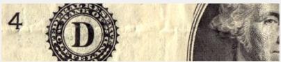 这个字母也呼应了在钞票正面四处出现的黑色数字。举例来说,如果你有一张来自达拉斯的印有字母K的钞票,那么钞票上的数字就应该是11,因为K是字母表中的第11个字母。