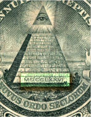 这些字母是罗马数字的776。M是1000,D是500,C是200,L是50,XX是20,VI是6。把金字塔下面的这些数字加在一起,你就会得到1776这个年份的数字,这一年《独立宣言》签署,而开始了“Novus Ordo Seclorum(新时代秩序)”。