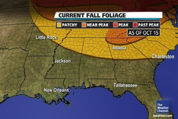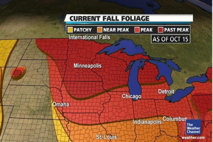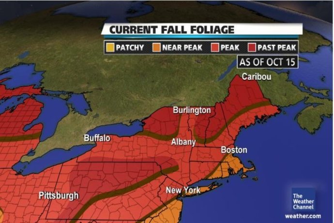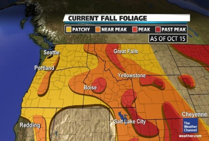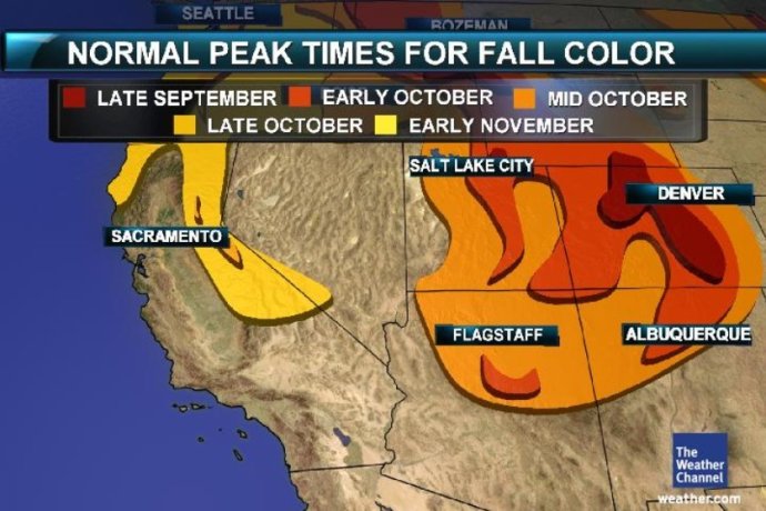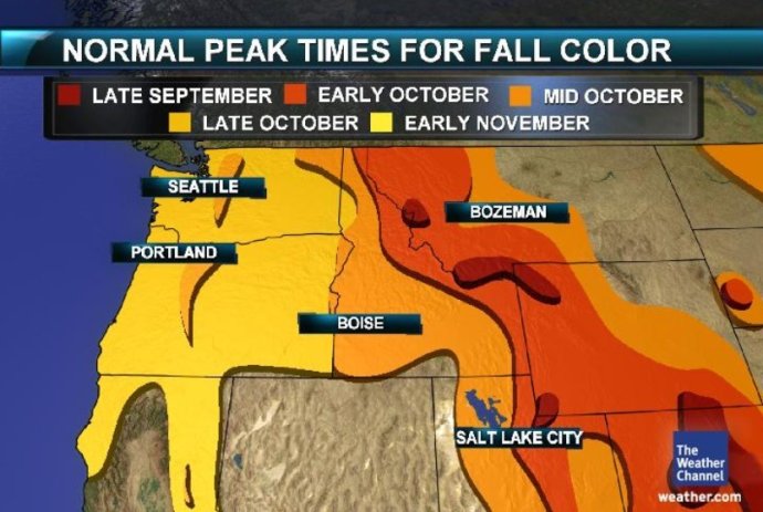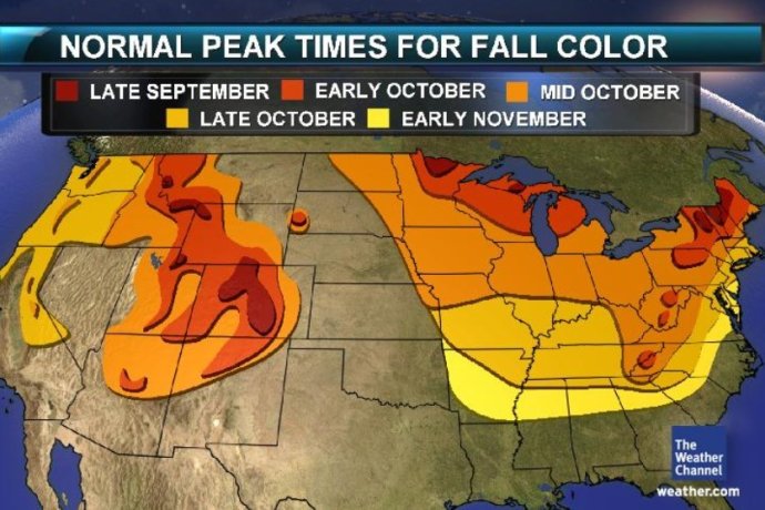 这是一张全美正常红叶高峰时间地图,根据颜色的深浅,分别代表9月末、十月初、十月中、十月末和十一月初。