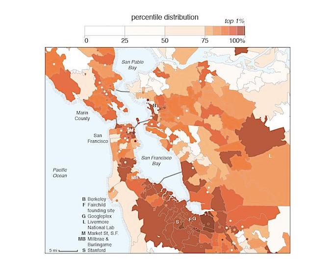 上面是一副硅谷的新地图,显示的是硅谷公司发展质量的差异,颜色越深,公司发展越好。