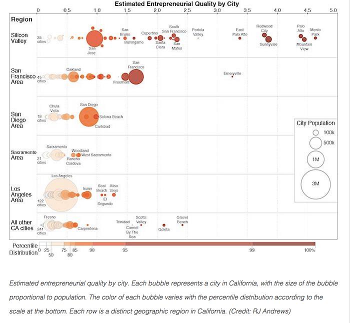 两位教授还研究了城市的因素。上图显示的是加利福尼亚六个地区的科技公司发展状况,每个圆圈代表一个城市,圆圈大小代表的是城市的人口,越往图像右侧,说明公司发展越好。通过对比,硅谷的发展明显要优于加利福尼亚的其他地区。