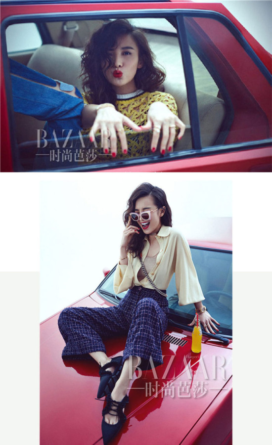 还有最近宋佳为《时尚芭莎》拍的片也是喇叭裤。