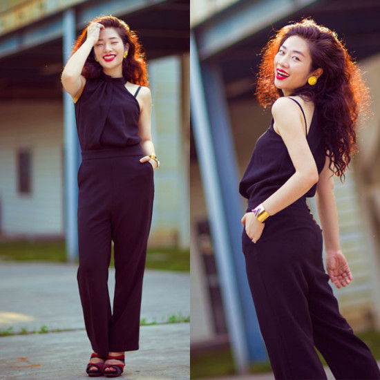 虽然没有耳环及肩,但这硕大的耳环也够了吧。黑色连体裤:Coven Garden,手镯:LouisVuitton,耳环:Reineren,鞋子:JenniferModo。